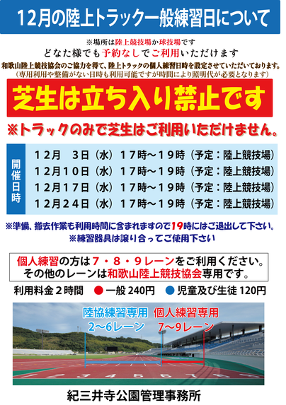 紀三井寺公園(面積約17.23ha、約172,300㎡(平成22年3月に紀三井寺緑地併合)の中に陸上競技場、野球場、テニス場、球技場・補助競技場、登はん場を設置しております。浜の宮の海岸から約600mの距離にあり、公園からは名草山、船尾山が臨めます。紀三井寺公園は災害時の広域避難場所です。陸上競技場は津波避難ビルとなっており地震時は2F入口及び東ゲート2か所が自動で開錠します。北駐車場完成に伴い公園面積は約4300㎡増えました。